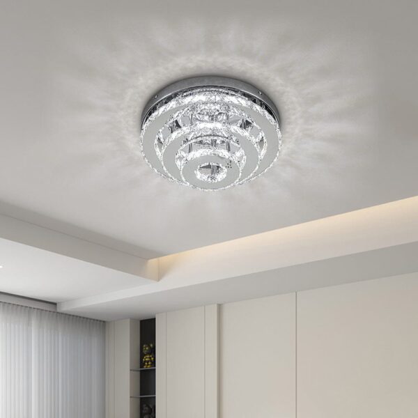 Description. Elevate your space with our chic crystal flush mount ceiling light, a mesmerizing three-tiered masterpiece that brings dazzling allure to low ceilings. Crafted from premium stainless steel and clear crystals, it exudes opulence and sophistication, casting an enchanting light that captivates any room. Featuring built-in LED lights, this chandelier eliminates the hassle of purchasing bulbs separately. While installation may be complex due to its intricate design and weight, professional assistance ensures flawless placement.. Features. 3-tiered design adds depth and elegance, perfect for low-celling rooms. Durable stainless steel base ensures longevity and stability. An ideal addition to living rooms, dining areas, cloakrooms and lounges. Specifications. Overall Dimensions: 35cm Dia x 15cm H. Primary Material: Crystal, Stainless Steel. Finish: Chrome. Light Temperature: Cool White. Dimmable: No. Wattage: 36W. Number of Lights: 3. Canopy Included: Yes. Power Source: Hardwired. Crystal Component: Yes. Package Content. 1 x Crystal Chandelier. Package Specifications. Package Dimensions (WxDxH): 43 x 43 x 25cm. Gross Weight: 3.3kg. Notice. Please allow a slight 1-3cm difference due to manual measurement.. Please allow a slight colour difference. ?Due to different monitors and lights, the picture may not reflect the actual colour of the item.