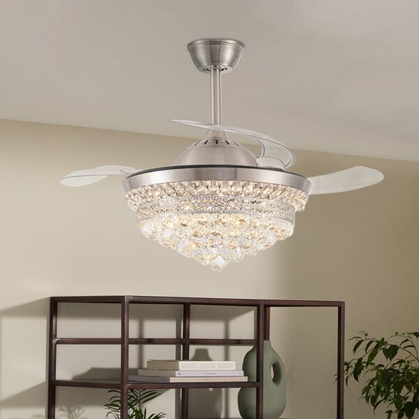 Our Livingandhome crystal ceiling fan light is exactly what you want if you want to achieve brightness and coolness at the same time. Adorned with glittering crystal balls that are perfectly complemented by the glossy chrome detailing, this light makes for a gorgeous statement piece in any room. It’s even more marvelous when turned on, it catches light wonderfully and the refraction from the crystal will cast a heaven-like illumination in your room.. Features:. Includes 2 adjustable rods for suiting rooms of different ceiling heights. 3 colour-changing LED light (warm/white/neutral) for creating the right mood. All-copper motor of high quality promises a silent operation. Low consumption with the LED technology and powerful motor. Dimensions Details:. Voltage: 240V. RPM: 210-220. Power: 60W. Material: ABS, Crystal. Number of Blades: 3. Remote Control: Yes. Dimmable: Yes. Colour Temperature: 3000k or 4000k or 6500k. Size:. Overall: Dia 107cm. Shade: Dia 50cm. Height: 49-59cm. Rod 10-20cm. Canopy Dia 15cm. Package Included. 1 x Ceiling Fan Light. 1 x Remote Control