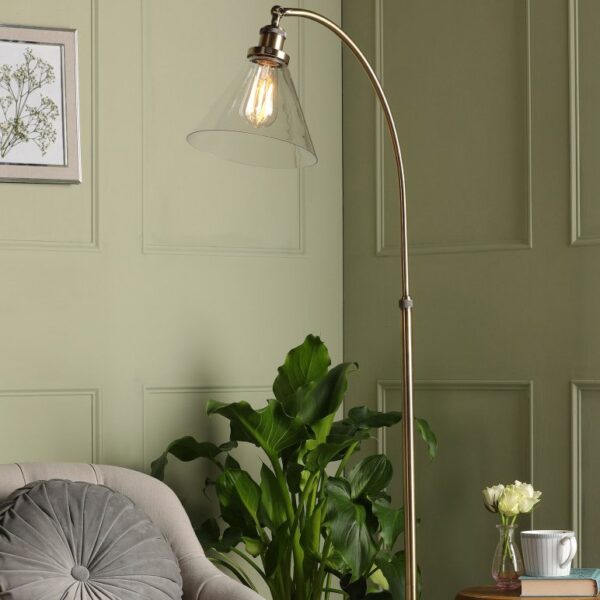 The Laura Ashley Isaac is a floor lamp that fits effortlessly into any space. Bold lines and angular shapes lend a sophisticated, contemporary touch that looks fantastic against bare brickwork. This contemporary floor lamp boasts industrial appeal with an antique brass finish and cone-shaped clear glass shade. Features Floor lamp Antique Brass finish Clear glass shade Takes 1 lamp Class 2 (double insulated) In line foot switch Size: Depth: 28cm Height: 152cm Width: 55cm Base diameter: 28cm Bulbs Requires 1 x Edison Screw LED GLS- not included