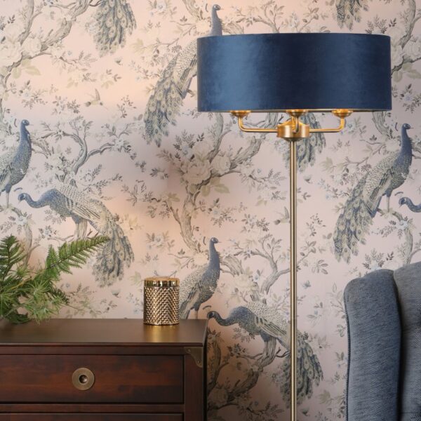 Laura Ashley Sorrento 3 Light Floor Lamp In Antique Brass Finish With Blue Velvet Shade LA3756235-Q