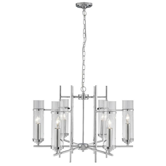 This Milo Chrome 6 Light Fitting with Clear Glass Cylinder Shades makes a stylish centrepiece for any room. The sleek chrome finish fitting has right angled arms and spokes leading off the central mast, with six beautifully designed cylindrical glass shades. The shades contain candle style light fittings that provide a bright source of light, and the chain suspension can be adjusted to the perfect ceiling height. Arriving in February 2018 Key Features Class (1, 2 or 3):- 1 (Earthed) Lampholder:- E14 Lamp Type:- Led – Candle Lamp Type:- 2 Wattage:- 10 Operating Voltage:- 230V 50hz Lamp Included:- No Shade Shade Type:- Glass Shade Finish:- Clear Shade Size:- H: 240(mm) W: 65(mm) Dimensions Total Height:- 425(mm) Total Height with Chain:- 915(mm) Width/Diameter:- 600(mm)