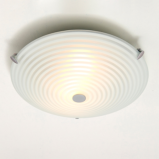 Glass flush ceiling light with decorative swirl detail to the opal glass shade. Both dimmable and suitable for use with LED lamps. Matching wall light available. FEATURES : Material : Glass, Steel Finish : Frosted/Clear, Chrome 2 x 40W E14 candle (bulb not included) Compatible with LED lamps Frosted/clear glass & chrome plate Constructed from glass & steel Available at an affordable price Images shown are for illustration purpose only DIMENSIONS : Projection : 95mm Diameter : 320mm